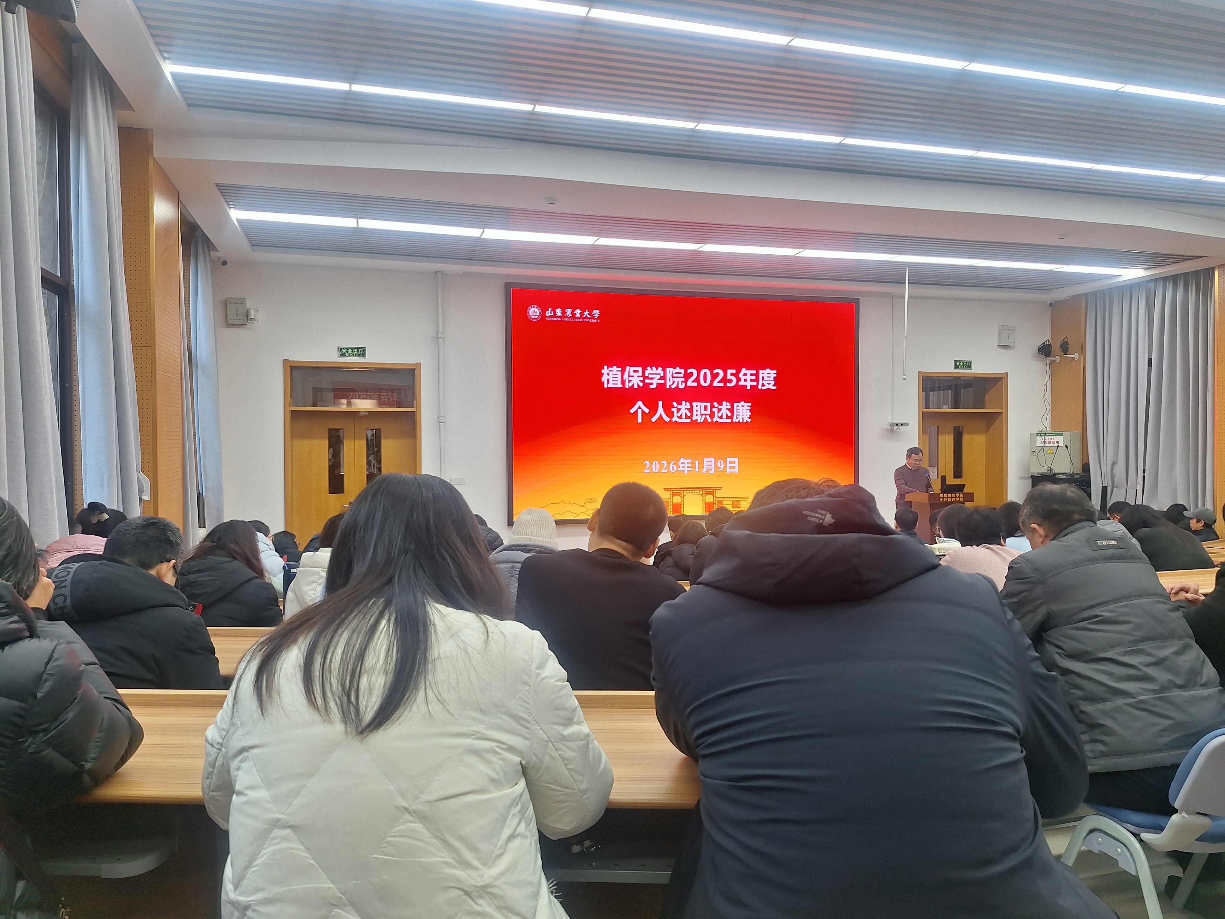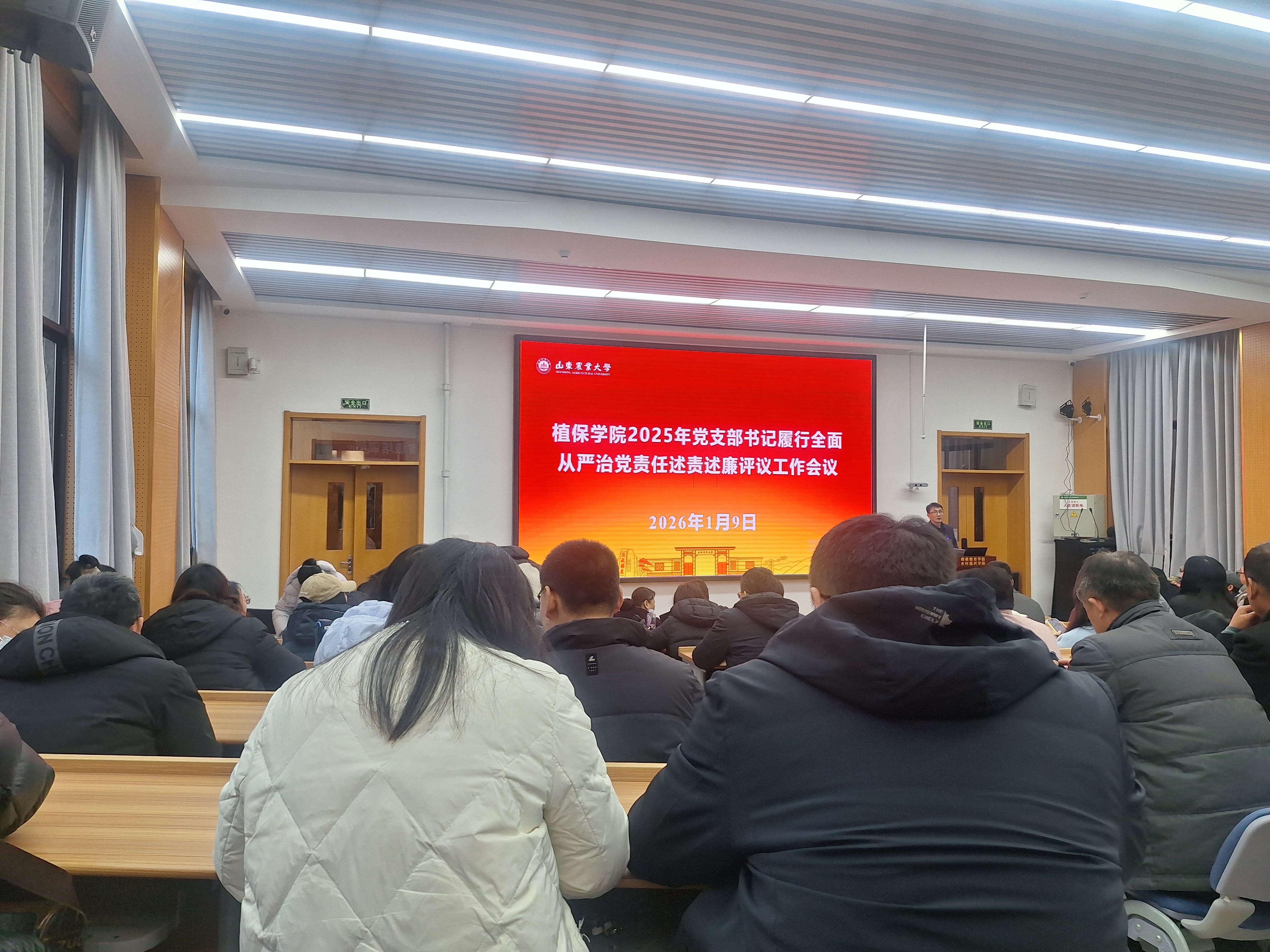 2016年1月9日下午,山东农业大学植保学院于岱宗校区5s106隆重召开2025年度全体教职工大会。会议围绕处级干部述职述廉、党支部书记述职、植物保护学科山东省高水平学科建设期满汇报三大议题展开,系统总结过去成绩,谋划未来发展蓝图。全院教工齐聚一堂,共话责任与使命,凝聚奋进力量。